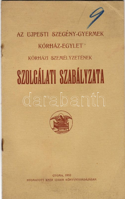 1910 Az Újpesti Szegény Gyermek Kórház-Egylet személyzetének szolgálat... https://www.darabanth.com/hu/21-Gyorsarveres/21.0/Festmeny-mutargy-papirregiseg-egyeb/Nyomtatvanyok~147/1910-Az-Ujpesti-Szegeny-Gyermek-Korhaz-Egylet-szemelyzetenek-szolgalati-szabalyzata-Kner-Iz~II39330