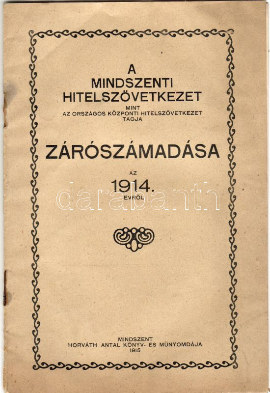 1915 A Mindszenti Hitelszövetkezet zárszámadása; Horváth Antal könyvny... https://www.darabanth.com/hu/21-Gyorsarveres/21.0/Festmeny-mutargy-papirregiseg-egyeb/Nyomtatvanyok~147/1915-A-Mindszenti-Hitelszovetkezet-zarszamadasa-Horvath-Antal-konyvnyomdaja~II39328