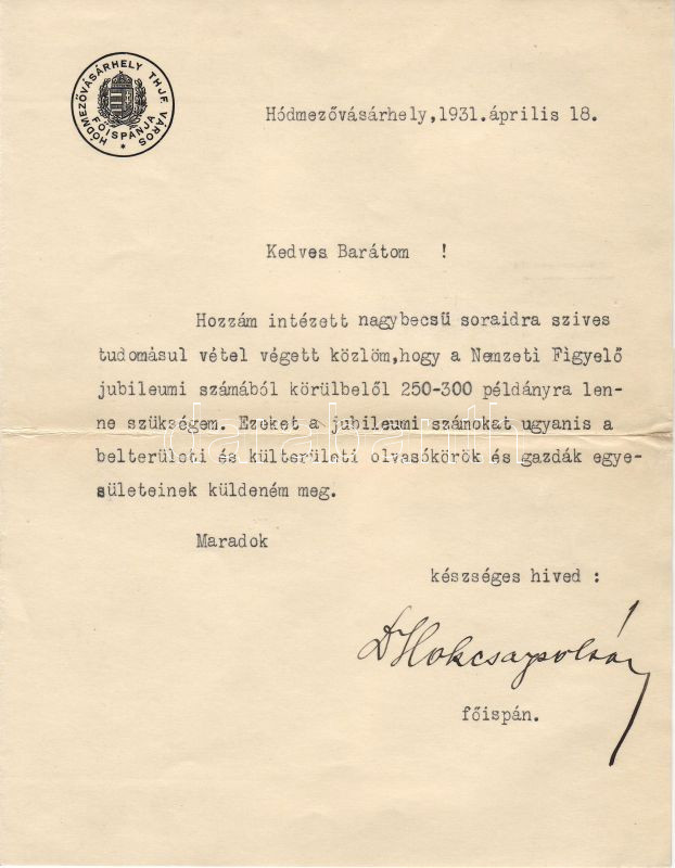 Leírás: 1931 Főispáni levél