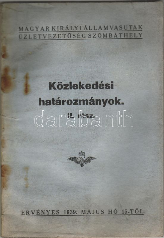 1939 M. Kir. Államvasutak: Közlekedési határozmányok II. https://www.darabanth.com/hu/21-Gyorsarveres/21.0/Festmeny-mutargy-papirregiseg-egyeb/Nyomtatvanyok~147/1939-M-Kir-Allamvasutak-Kozlekedesi-hatarozmanyok-II~II39340