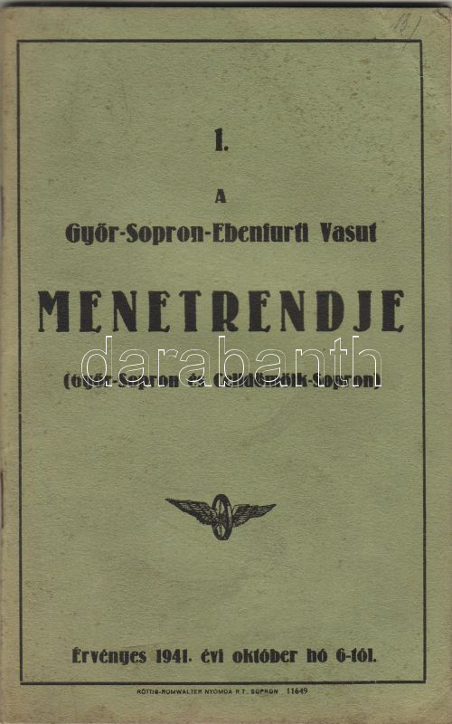 1941 A Györ-Sopron-Ebenfurti vasút menetrendje https://www.darabanth.com/hu/21-Gyorsarveres/21.0/Festmeny-mutargy-papirregiseg-egyeb/Nyomtatvanyok~147/1941-A-Gyor-Sopron-Ebenfurti-vasut-menetrendje~II39343