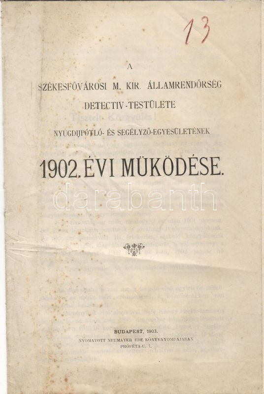 Leírás: A Székesfővárosi M. Kir. Államrendőrség Detectív-testülete nyugdíjpótló- és segélyegyesületének 1902 évi működése; Neumayer Ede nyomdája