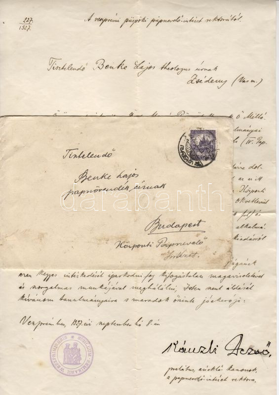 Leírás: Levél és boríték a veszprémi püspöki papnevelő rektorától
