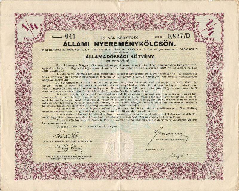 1941 Államad. kötvény 50P https://www.darabanth.com/hu/21-Gyorsarveres/21.0/Festmeny-mutargy-papirregiseg-egyeb/Reszvenyek-ertekpapirok-sorsjegyek~145/1941-Allamad-kotveny-50P~II40099