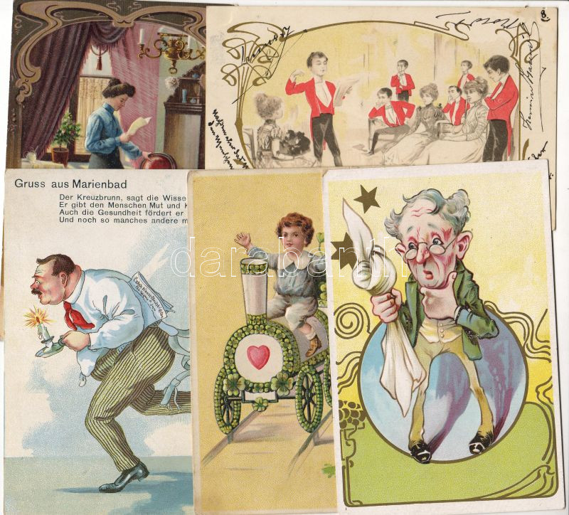 Leírás: 5 db századfordulós litho üdvözlő, humoros lap