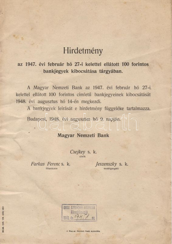 Leírás: 1947 MNB "Hirdetmény a 100Ft-os kibocsátásáról"
