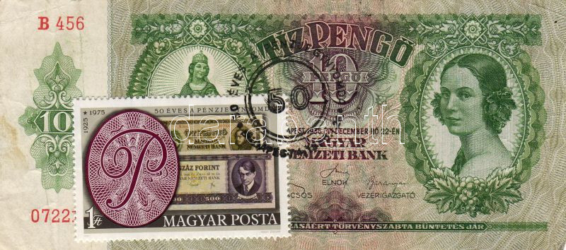 Leírás: 1936 10P, bankjegy vonatkozású ráragasztott postabélyeggel és alkalmi bélyegzéssel T:II