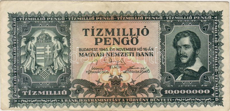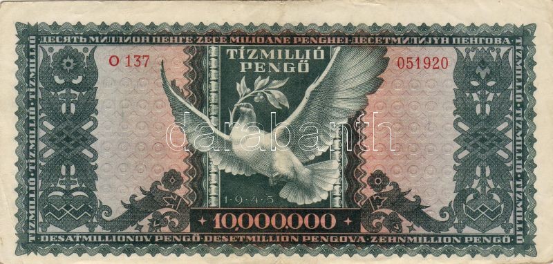 1946 10.000.000P erősen lecsúszott nyomással T:II https://www.darabanth.com/hu/21-Gyorsarveres/21.0/Numizmatika/Papirpenzek~136/1946-10000000P-erosen-lecsuszott-nyomassal-TII~II40015