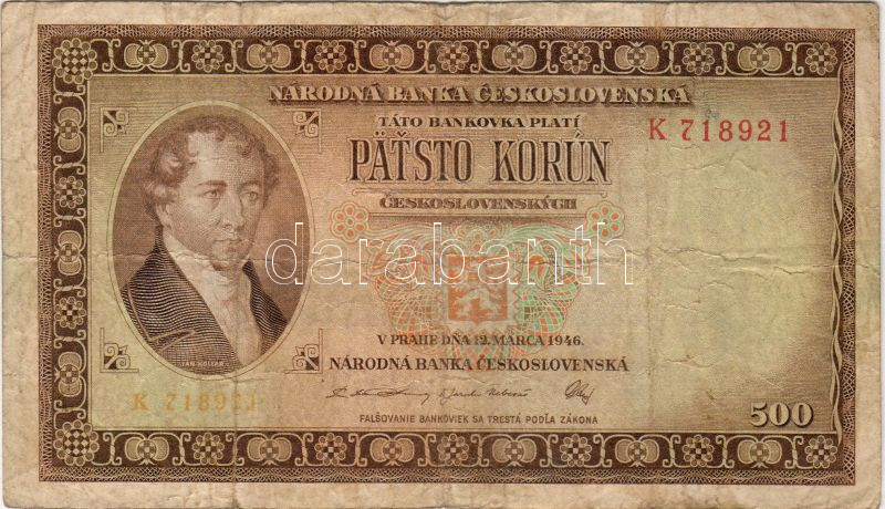 Csehszlovákia 1946 500K T:II/III https://www.darabanth.com/hu/21-Gyorsarveres/21.0/Numizmatika/Papirpenzek~136/Csehszlovakia-1946-500K-TIIIII~II39998
