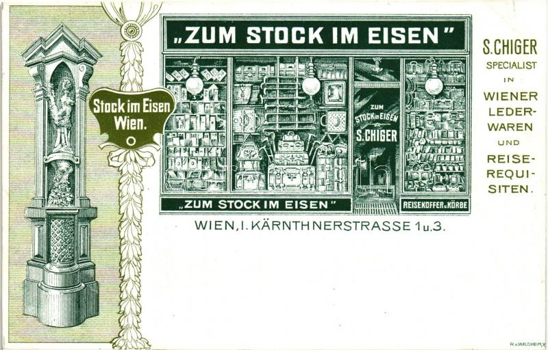 Vienna, Wien I. Kärnthnerstrasse 1-3 S. Chiger's 'Zum Stock im Eisen' Wiener Lederwaren und Reiserequisiten Geschäft / leatherware and travel requisite shop