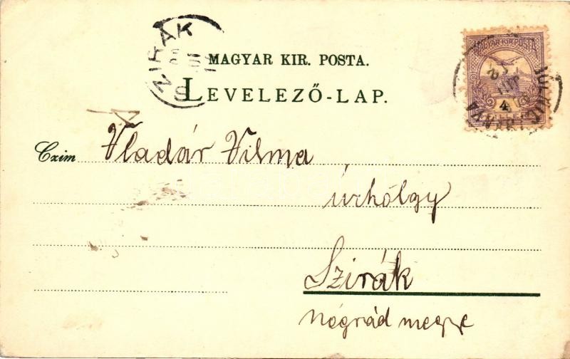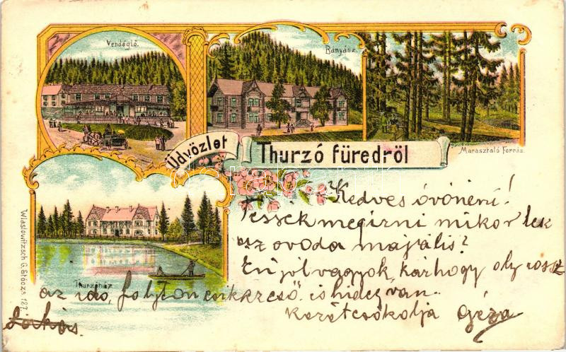 Leírás: Thurzófüred, Thurzó-ház, vendéglő, bányász üdülő, Marasztaló-forrás; Wlaszlovits Gusztáv kiadása / floral litho