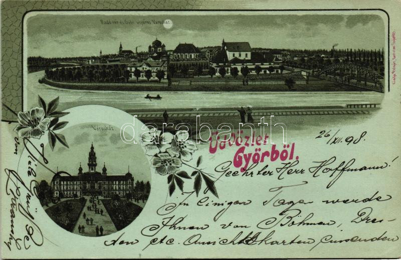 Leírás: 1898 Győr, Zsinagóga, kiadja Polgár Bertalan; floral litho