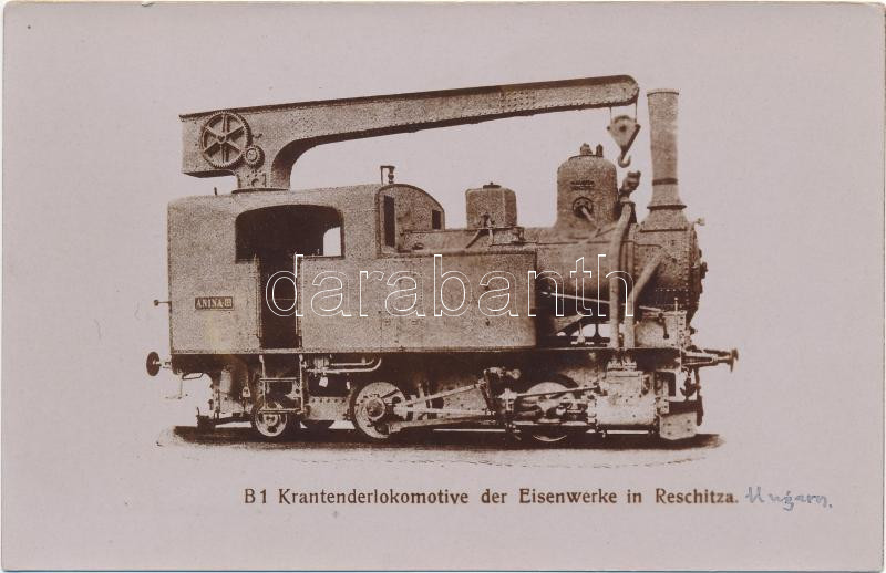 'Anina III' gőzmozdony, Resicai Vasgyár gyártmánya / B1 Kranterderloko... https://www.darabanth.com/hu/21-Nagyaukcio/21.1/Motivum-kepeslapok/Vonat~7488/Anina-III-gozmozdony-Resicai-Vasgyar-gyartmanya-B1-Kranterderlokomotive-der-Eisenwerke-in-R~II1084690