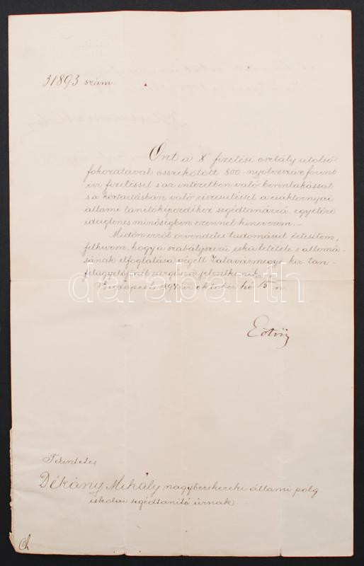 Leírás: 1894 Eötvös Loránd(1848-1919) vallás- és közoktatásügyi miniszter aláírása segédtanári kinevezési okiraton(Csáktornya, Zala)