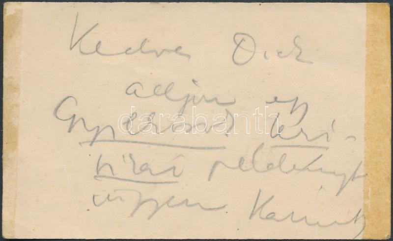 Leírás: Karinthy Frigyes (1887-1938) író névjegykártyájára írt sorai Dick Manó könyvkiadónak