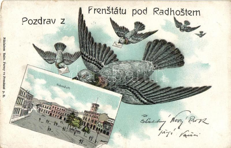 Leírás: Frenstát pod Radhostem, Námestí; nákladem R. Parmy / main square, birds, litho (EK)