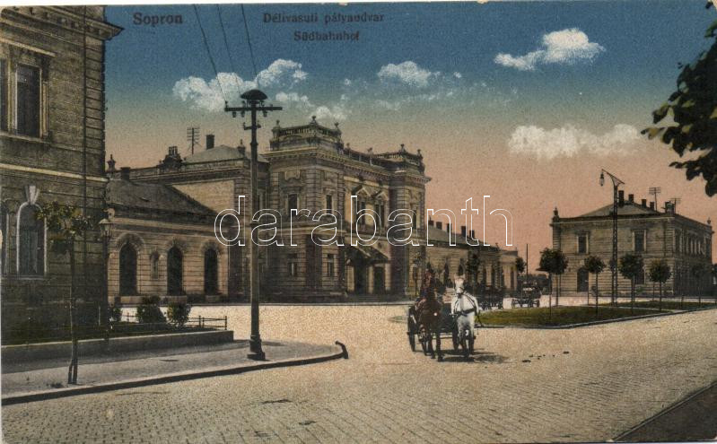 Sopron, Déli vasúti pályaudvar https://www.darabanth.com/hu/210-Gyorsarveres/210.0/Kepeslapok/Magyarorszag~5/Sopron-Deli-vasuti-palyaudvar~II864897