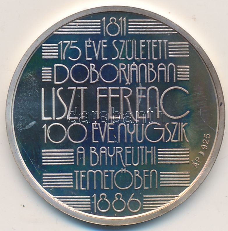 Fülöp Zoltán (1951-) 1986. "175 éve született Doborjánban Liszt Ferenc - 100 éve nyugszik a Bayreuthi temetőben" Ag emlékérem sérült ÁP dísztokban és tanúsítvánnyal (12g/0.925/32mm) T:PP