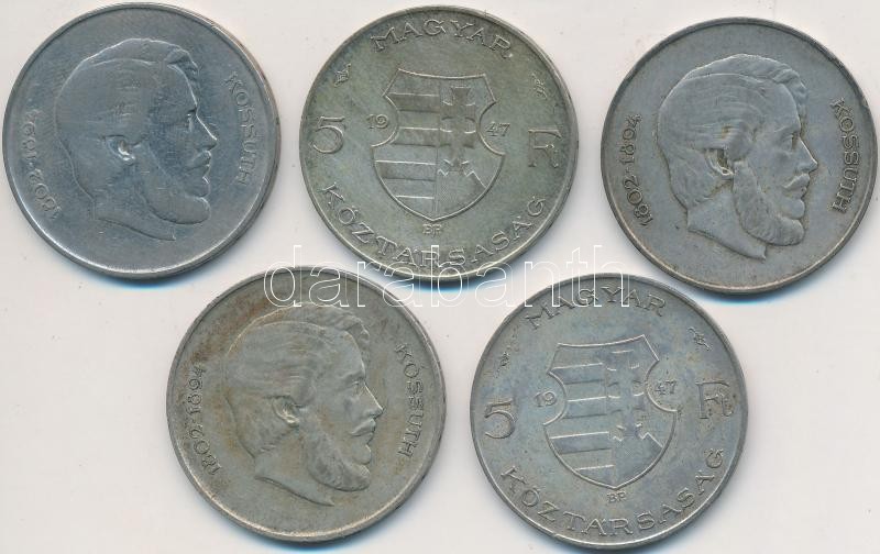 1947. 5Ft Ag "Kossuth" (5x) T:vegyes https://www.darabanth.com/hu/210-Gyorsarveres/210.0/Numizmatika/Magyar-fem-es-ezustpenzek~100/1947-5Ft-Ag-Kossuth-5x-Tvegyes~II868090