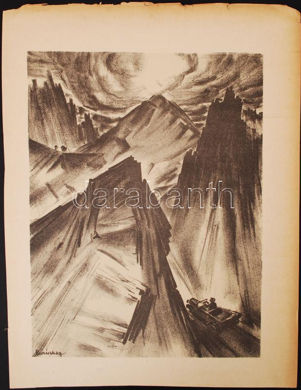 Leírás: Ruzicskay György (1896-1993): Hegyek között. Algrafia, papír, jelzett az algrafián, 24×18 cm