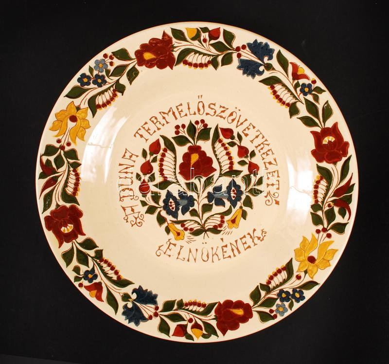 Leírás: Nagy méretű gazdagon díszített fazekas dísztál " A Duna termelőszövetkezet elnökének" felirattal, hibátlan, jelzés nélkül, d:35 cm