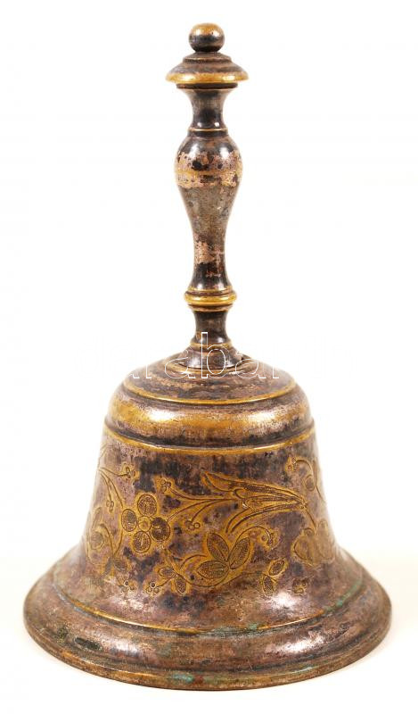 Leírás: Antik csengő, fém, gravírozott növényi díszítéssel, m:9 cm