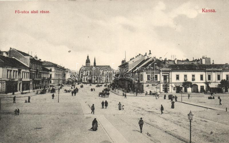 Leírás: Kassa, Fő utca, Erzsébet székesegyház, Adriányi és Markó üzlete, kiadja Nyulászi Béla / street, cathedral, shop