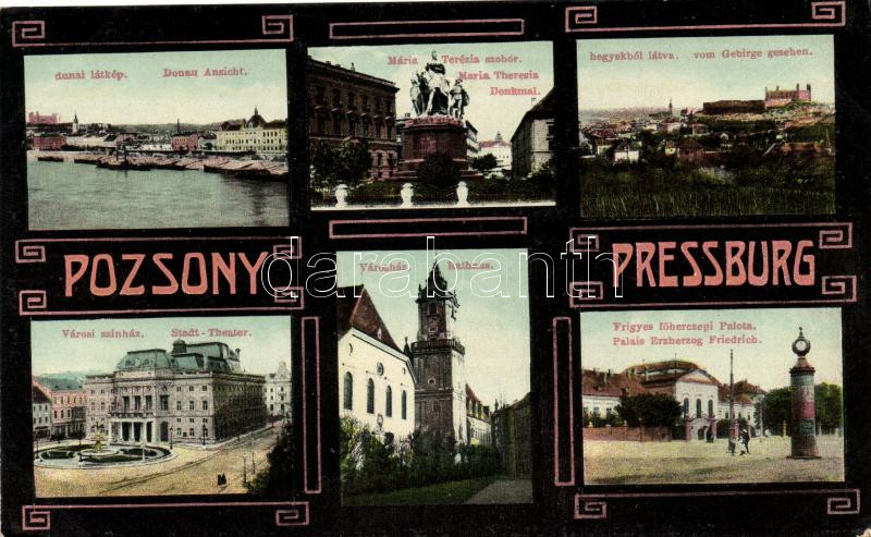 Leírás: Pozsony, városháza, Városi színház, Mária Terézia szobor, Frigyes főherceg Palota / town hall, theatre, statue, palace (EK)