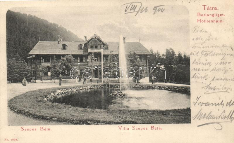 Tátra, Barlangliget, villa Szepes Béla https://www.darabanth.com/hu/211-Gyorsarveres/211.0/Kepeslapok/Felvidek~800008/Tatra-Barlangliget-villa-Szepes-Bela~II873544