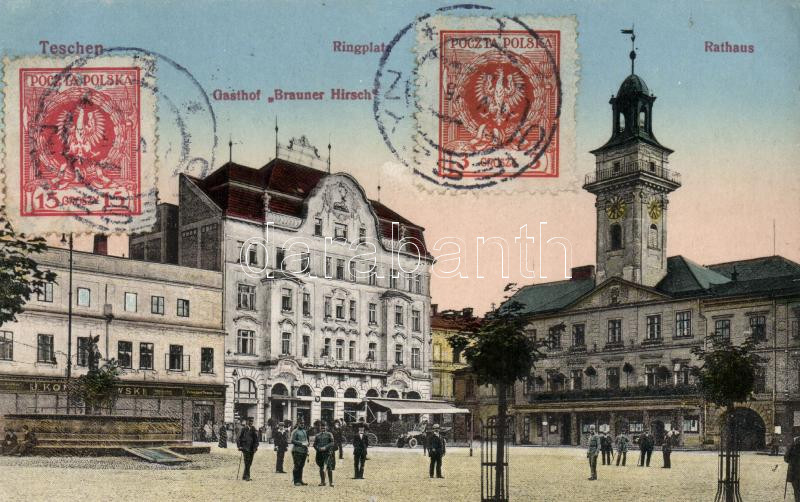 Cieszyn, Teschen; Ringplatz, Rathaus, Gasthof Brauner Hirsch / square,... https://www.darabanth.com/hu/211-Gyorsarveres/211.0/Kepeslapok/Lengyelorszag~800040/Cieszyn-Teschen-Ringplatz-Rathaus-Gasthof-Brauner-Hirsch-square-town-hall-hotel-automobiles~II874569