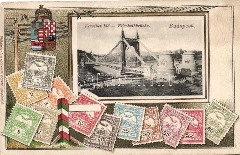Budapest, Erzsébet híd, magyar bélyegek, címer, litho https://www.darabanth.com/hu/211-Gyorsarveres/211.0/Kepeslapok/Magyarorszag~800006/Budapest-Erzsebet-hid-magyar-belyegek-cimer-litho~II870659