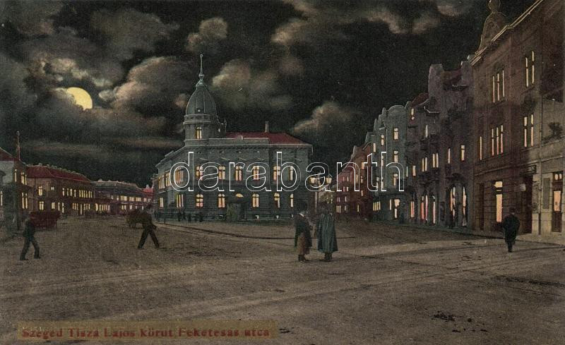 Leírás: Szeged, Tisza Lajos körút, Fekete sas utca, este, kiadja Pető Ernő