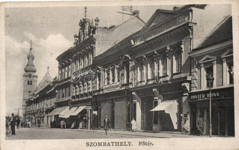 Leírás: Szombathely, Főtér, Pintér Ilona üzlete, fogorvos, Első Magyar Biztosító Társaság, templom