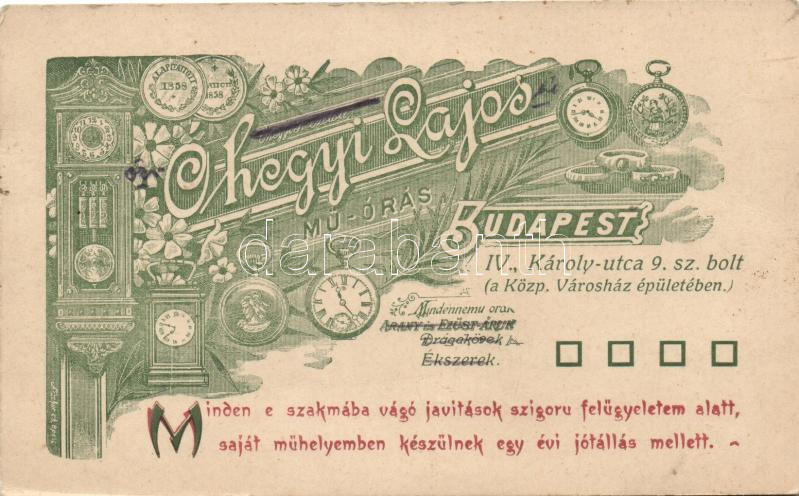 Leírás: Hegyi Lajos műórás kereskedése; Budapest, Károly utca 9. / watchmaker shop advertisement