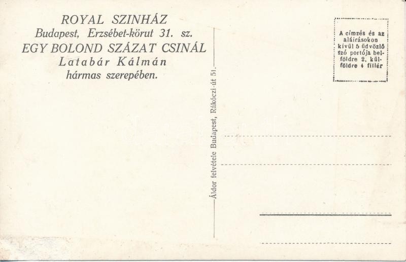 Latabár Kálmán, Egy bolond százat csinál, Budapest, Royal színház (Rb) https://www.darabanth.com/hu/211-Gyorsarveres/211.0/Kepeslapok/Szinesz~800114/Latabar-Kalman-Egy-bolond-szazat-csinal-Budapest-Royal-szinhaz-Rb~II875889