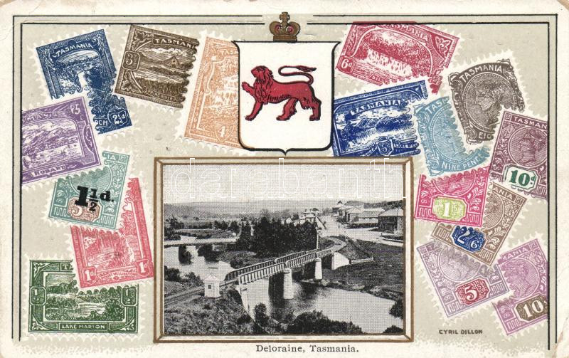 Deloraine, stamps, coat of arms, Emb. litho (EK) https://www.darabanth.com/hu/211-Gyorsarveres/211.0/Kepeslapok/Tazmania~800081/Deloraine-stamps-coat-of-arms-Emb-litho-EK~II870773