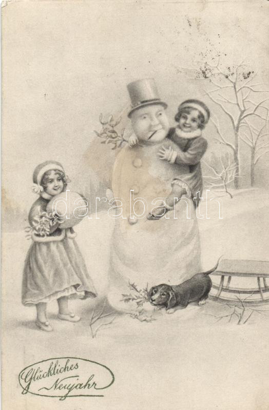 New Year, snowman, children, sleigh (EK) https://www.darabanth.com/hu/211-Gyorsarveres/211.0/Kepeslapok/Udvozlolap~800117/New-Year-snowman-children-sleigh-EK~II874903
