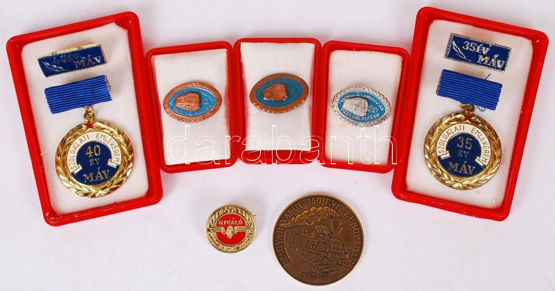 ~1970-1980. "Magyar Államvasutak Szolgálatáért" 10 év (2x) és 20 év után + "Szolgálati Emlékérem" 35 és 40 év után törzsgárda jelvények tokban + "Kiváló Szocialista Brigád+ jelvény + Bognár György (1944-) 1996. "Magyar Vasút - 150 Éve Európában, PEST-BUDA" Br emlékérem (42,5mm) T:2