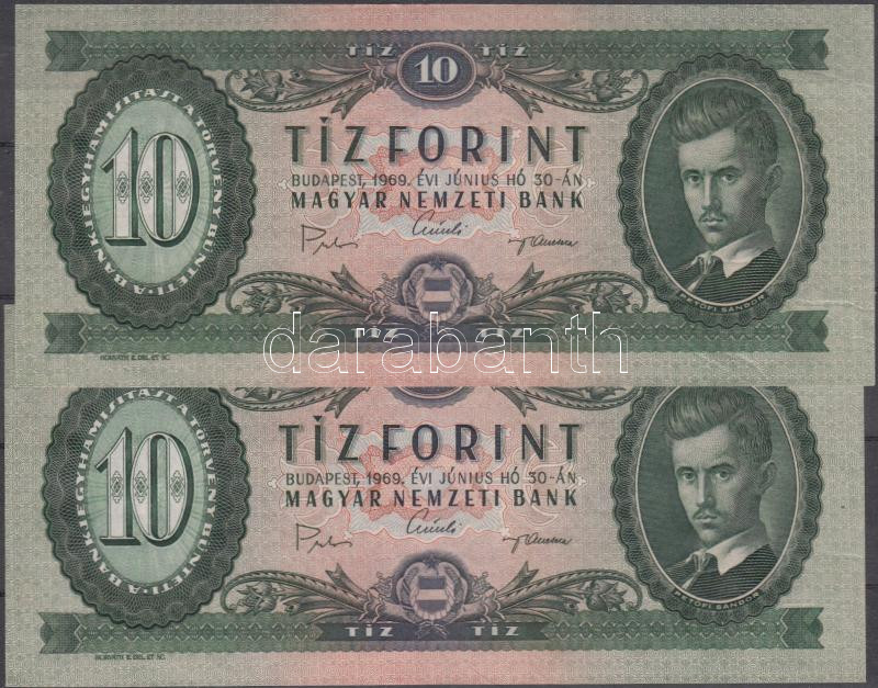 1969. 10Ft (2x) sorszámkövetők T:I- https://www.darabanth.com/hu/211-Gyorsarveres/211.0/Numizmatika/Magyar-bankjegyek~600007/1969-10Ft-2x-sorszamkovetok-TI-~II876534