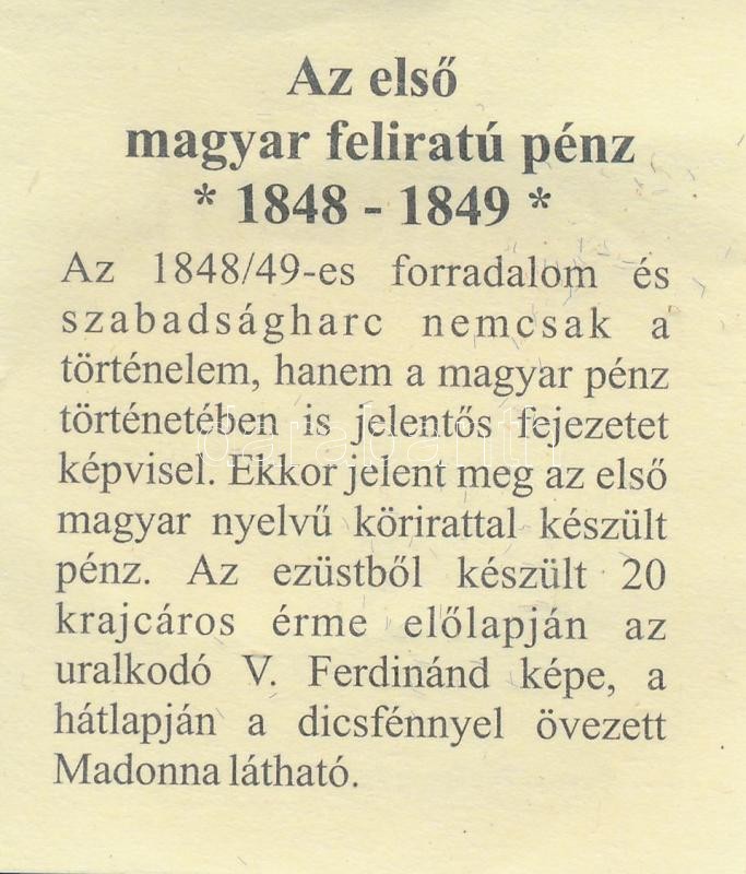 Leírás: DN "A magyar nemzet pénzérméi - Az első magyar feliratú pénz 1848-1849." Ag (0,999) emlékérem tanúsítvánnyal (10,37g/35mm) T:PP