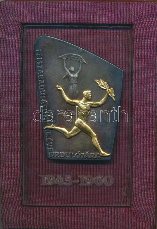 Leírás: Vincze Dénes (1924-1972) 1960. "Felszabadulásunk 15. évfordulójára" aranyozott Br lemezérem plexi talpon dísztokban (110x67mm) T:2