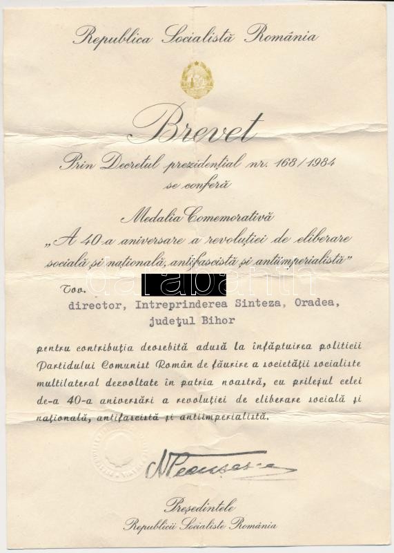 Románia 1984. "A felszabadulás 40. évfordulója" Br kitüntetés adományozói okirattal T:2