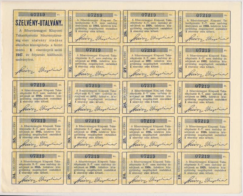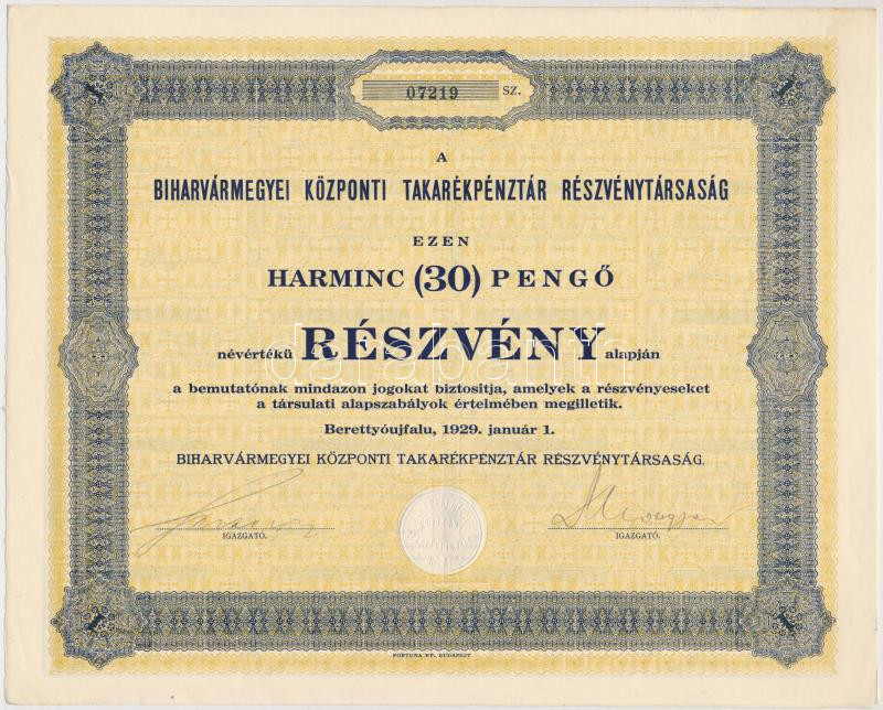 Berettyóújfalu 1929. "Biharvármegyei Központi Takarékpénztár Részvényt... https://www.darabanth.com/hu/211-Gyorsarveres/211.0/Numizmatika/Reszvenyek-es-sorsjegyek~600005/Berettyoujfalu-1929-Biharvarmegyei-Kozponti-Takarekpenztar-Reszvenytarsasag-reszveny~II872976