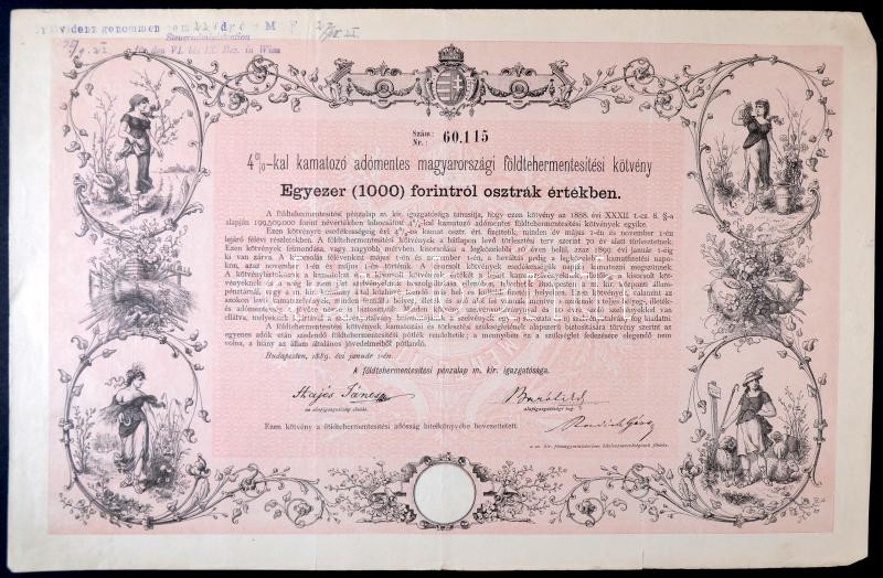 Leírás: Budapest 1889. "4%-kal kamatozó magyarországi földtehermentesítési kötvény" 1000Ft-ról bélyegzéssel, szelvényekkel T:III