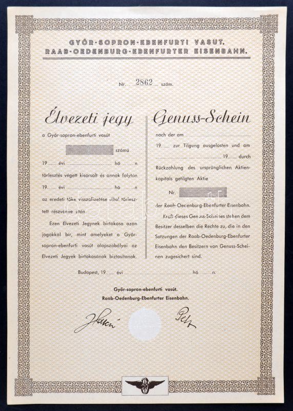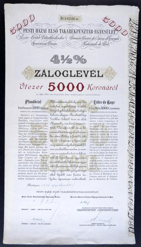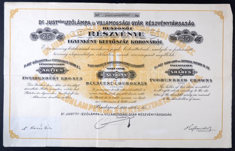 Budapest 1916. "Pesti Hazai Első Takarékpénztár-Egyesület" 4 1/2% Záloglevél 5000K-ról, két szelvénnyel, szárazpecséttel + 1923. "Dr. Just-féle Izzólámpa és Villamossági Gyár Részvénytársaság" részvénye 25x200 Koronáról, szelvényekkel magyar, francia és német nyelven + Budapest DN "Győr-Sopron-Ebenfurti Vasút" kitöltetlen élvezeti jegye, szárazpecséttel T:I,III