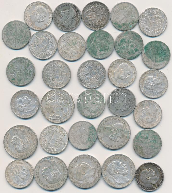 Leírás: Osztrák-Magyar Monarchia 1893-1915. Vegyes ezüst korona tétel a következő felosztásban: 1K Ag (24x) + 2K Ag (6x) T:2-,3,3-