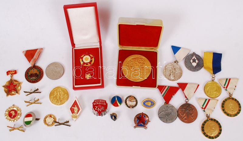 Leírás: Vegyes tétel főleg a szocialista időszakból, benne sportérmek, emlékérmek, jelvények dobozban T:vegyes