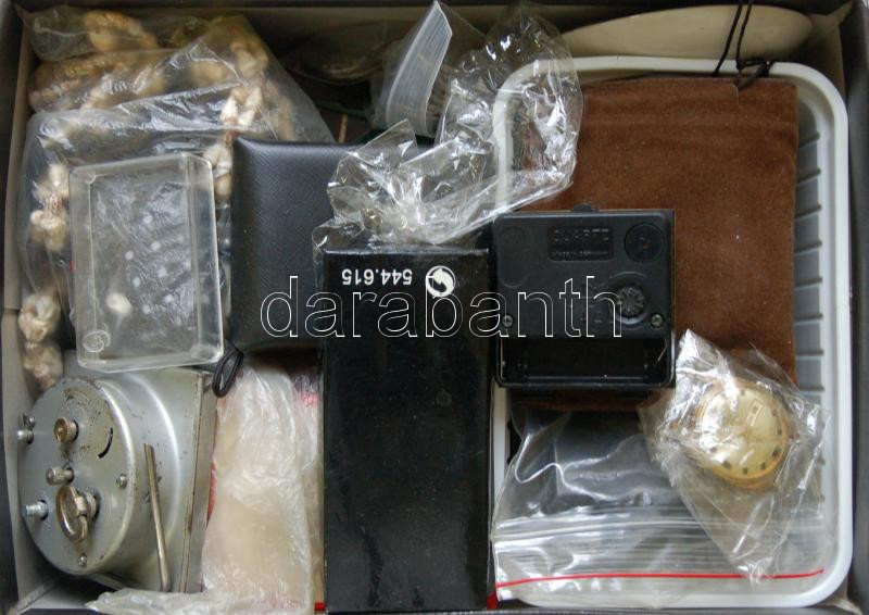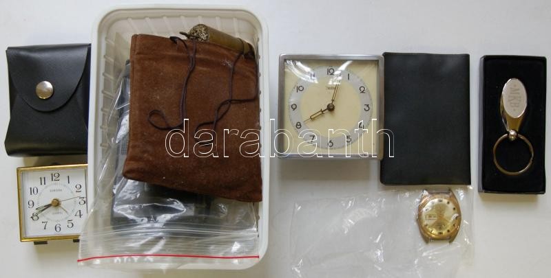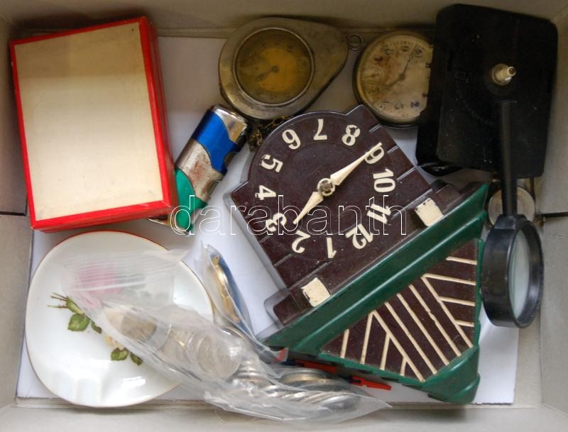 Leírás: Kis vegyes bolhapiac tétel, benne hibás és működőképes órák, diktafon, fémpénzek, iránytű, számológép, bizsuk stb., cipősdobozban