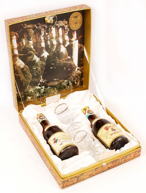 Leírás: 1981 Tokaji Édes Szamorodni, palackozta: Tokaj hegyalja ÁG, 250 ml és 1975 3 puttonyos aszú, 250 ml, díszdobozban 2 üveg pohárral