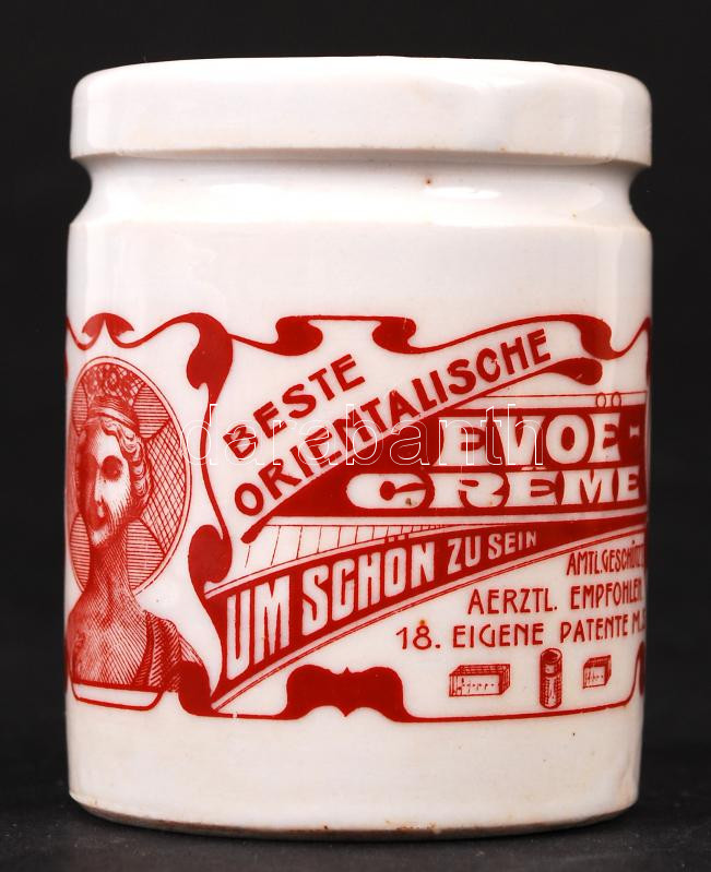 Leírás: Beste orientalische Evoe Créme um schön zu sein porcelán gyógyszeres tégely, d: 5 cm, m: 6,5 cm